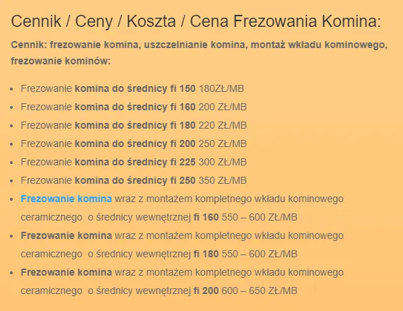 - Chimney modifications: 170–260 zł za metr bieżący.