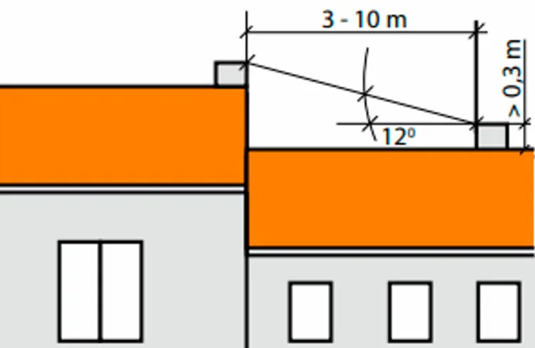 - W przypadku dachów stromych z pokryciem łatwopalnym, wysokość komina również wynosi 60 cm ponad kalenicę.